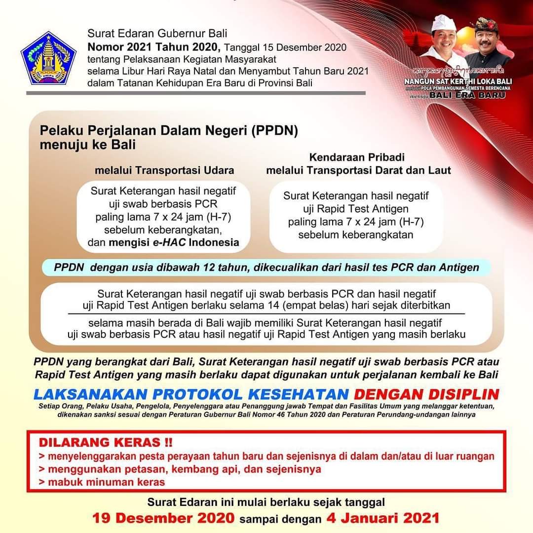 Direvisi Surat Edaran Gubernur Bali Nomor 2021 Tahun 2020, Tanggl 15 Desember 2020 tentang pelaksanaan kegiatan masyarakay selema liburan Natal dan Menyambut tahun Baru 2021 dalam Tatanan Kehidupan Era Baru di propinsi Bali .